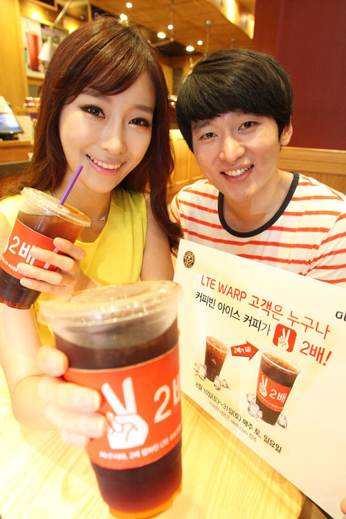‘아이스 커피 2배 업그레이드’를 원하는 가입자들은 ‘커피빈’ 매장에서 LTE폰의 화면 상단 ‘LTE’나 ‘4G’ 로고 및 휴대폰 뒷면 커버의 ‘올레(olleh)’ 로고를 통한 LTE 워프 가입자 확인이 필요하며, KT는 선착순 3만 명에게 ‘아이스 커피’ 2배 업그레이드 혜택을 제공할 예정이다.