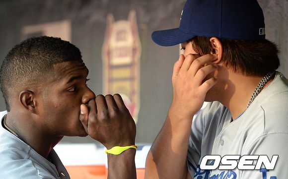 7일(이하 한국시간) 미국 미주리주 세인트루이스에 위치한 부시스타디움에서 열린 2013 메이저리그 세인트루이스 카디널스와 LA 다저스의 경기, 경기에 앞서 다저스 푸이그와 류현진이 이야기를 하고 있다.
