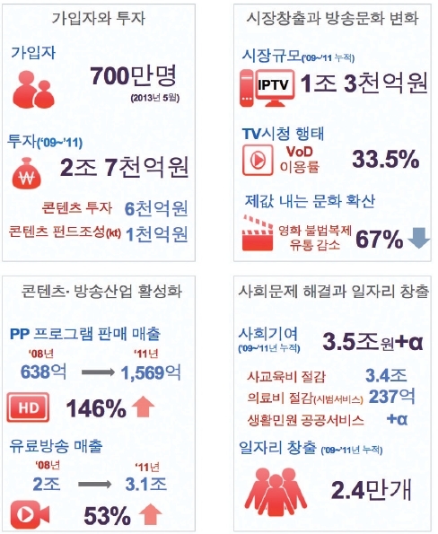 IPTV는 콘텐츠 산업의 활성화에 크게 기여했으며 나아가 전체 방송시장의 성장을 견인하고 있다. 본 보고서에 따르면 IPTV 사업자는 방송수신료의 60~70%를 콘텐츠 사용료로 지급했으며, 그 결과 2011년 방송채널용사업자(PP)의 프로그램 판매수익은 2008년 대비 146% 증가했고 유료방송시장의 방송수익도 같은 기간 53% 증가하는 등 놀라운 성장세를 기록했다.
