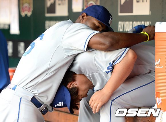 7일(이하 한국시간) 미국 미주리주 세인트루이스에 위치한 부시스타디움에서 열린 2013 메이저리그 세인트루이스 카디널스와 LA 다저스의 경기, 경기에 앞서 다저스 푸이그와 류현진이 장난을 치고 있다.