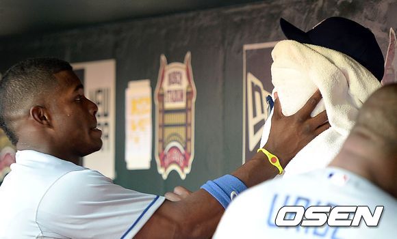 7일(이하 한국시간) 미국 미주리주 세인트루이스에 위치한 부시스타디움에서 열린 2013 메이저리그 세인트루이스 카디널스와 LA 다저스의 경기, 경기에 앞서 다저스 푸이그와 류현진이 장난을 치고 있다.