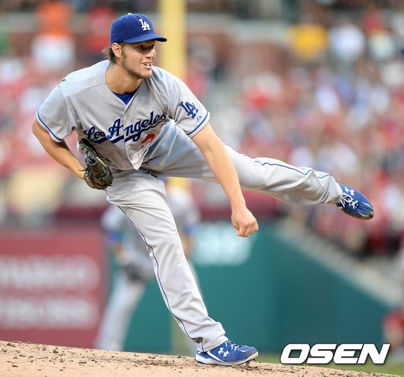 7일(이하 한국시간) 미국 미주리주 세인트루이스에 위치한 부시스타디움에서 열린 2013 메이저리그 세인트루이스 카디널스와 LA 다저스의 경기, 1회말 무사에서 다저스 선발투수 커쇼가 힘차게 공을 던지고 있다.