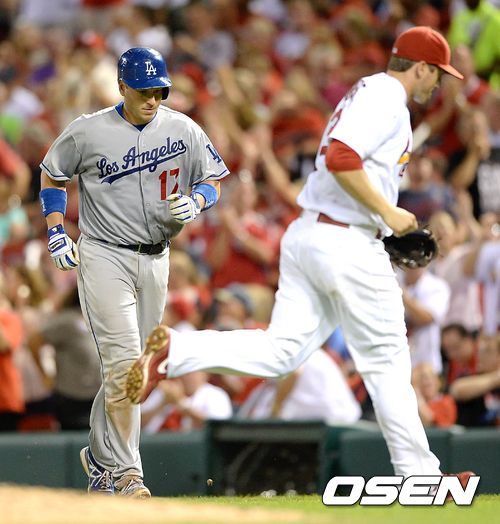 7일(이하 한국시간) 미국 미주리주 세인트루이스에 위치한 부시스타디움에서 열린 2013 메이저리그 세인트루이스 카디널스와 LA 다저스의 경기, 6회초 1사 만루에서 다저스 엘리스가 병살타를 치고 덕아웃으로 가고 있다.