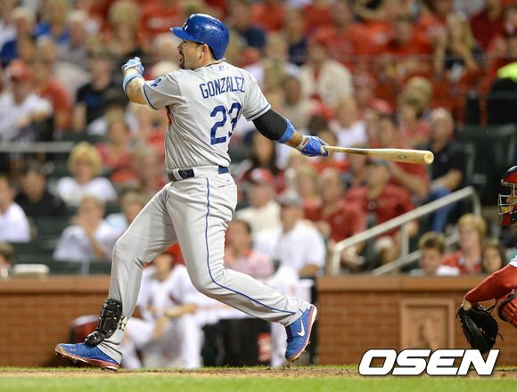 7일(이하 한국시간) 미국 미주리주 세인트루이스에 위치한 부시스타디움에서 열린 2013 메이저리그 세인트루이스 카디널스와 LA 다저스의 경기, 6회초 1사 3루에서 다저스 곤살레스가 좌전 적시타를 치고 있다.