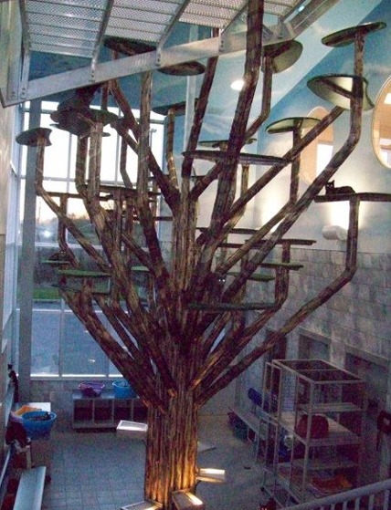 이는 미국 오하이오 동물보호센터 '엔젤스 포 애니멀스'에는 고양이 전용 놀이터 나무로 알려졌다. 높이 7미터가 넘고 가지가 36개인 이 인공나무는 고양이들이 마음껏 뛰어놀고 숨을 수 있게 만들어졌다.