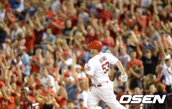 7일(이하 한국시간) 미국 미주리주 세인트루이스에 위치한 부시스타디움에서 열린 2013 메이저리그 세인트루이스 카디널스와 LA 다저스의 경기, 8회말 2사 1루에서 세인트루이스 아담스가 우월 투런 홈런을 치고 그라운드를 돌고 있다.