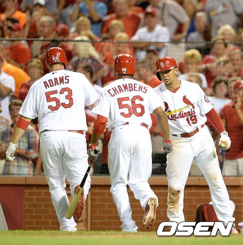 8회말 2사 1루에서 세인트루이스 아담스가 우월 투런 홈런을 치고 홈에서 동료들과 환호하고 있다. /sunday@osen.co.kr