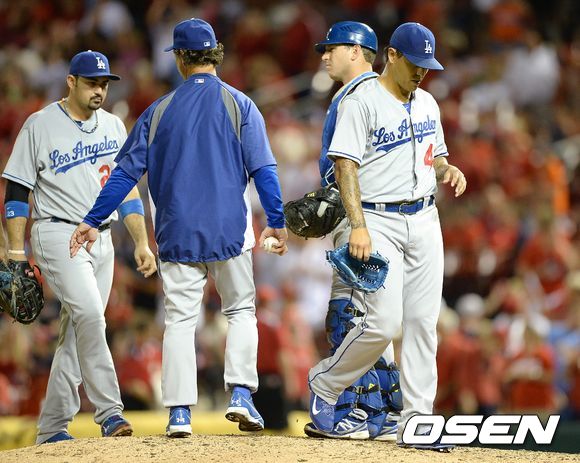 8회말 2사 1루에서 세인트루이스 아담스에게 투런 홈런을 허용한 다저스 리그가 마운드를 내려가고 있다. /sunday@osen.co.kr