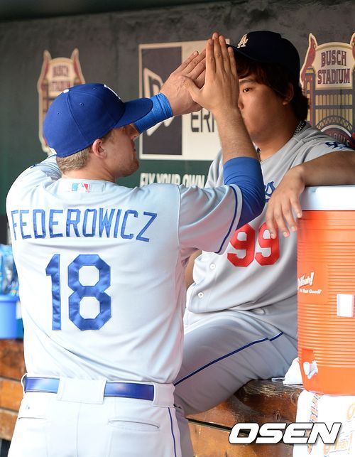 경기에 앞서 다저스 페데로위츠가 취재진을 의식해 류현진의 얼굴을 가리며 장난을 치고 있다. /sunday@osen.co.kr