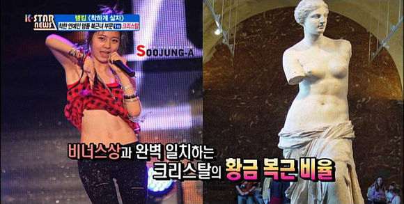 또한 이날 방송에서는 크리스탈 외에도 폴 댄스를 이용해 만든 DYI 복근 애프터스쿨의 정아, 이 악물고 만든 소녀시대 유리의 삼지창 복근, 1일 1식과 15키로 덤벨로 다져진 씨스타 소유의 코르셋 복근 등도 공개됐다. 방송은 7일 오후 11시.