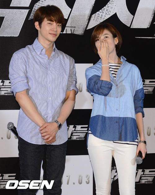 7일 오후 서울 압구정 CGV에서 진행된 영화 '감시자들(감독 조의석, 김병서) 500만 공약 실천 이벤트'에서 한효주가 이준호에게 이야기를 하고 있다.