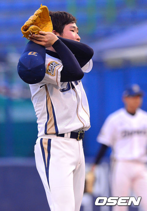 7일 오후 경남 창원 마산구장에서 열린 '2013 한국야쿠르트 세븐 프로야구' NC 다이노스와 LG 트윈스의 경기, 1회초 NC 선발투수 이재학이 땀을 닦고 있다