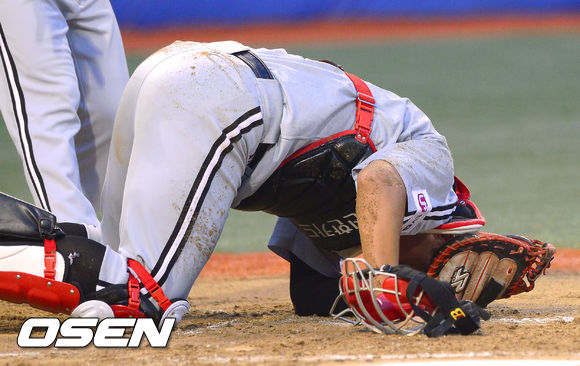 7일 오후 경남 창원 마산구장에서 열린 '2013 한국야쿠르트 세븐 프로야구' NC 다이노스와 LG 트윈스의 경기, 3회말 무사 NC 박으뜸의 파울타구에 급소를 맞은 LG 윤요섭 포수가 고통스러워하고 있다.