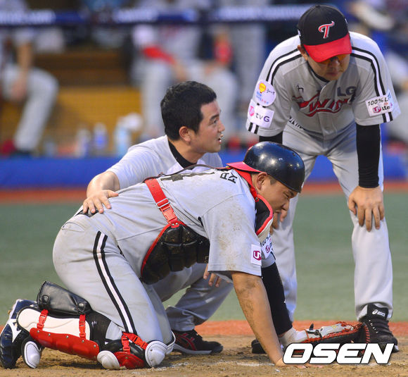 7일 오후 경남 창원 마산구장에서 열린 '2013 한국야쿠르트 세븐 프로야구' NC 다이노스와 LG 트윈스의 경기, 3회말 무사 NC 박으뜸의 파울타구에 급소를 맞은 LG 윤요섭 포수가 고통스러워하고 있다.