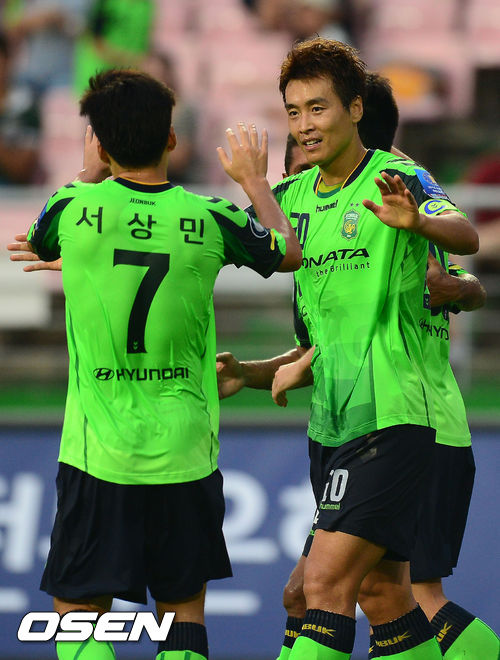 경기 전반 전북 이동국이 선취골을 넣은 뒤 서상민과 기뻐하고 있다.