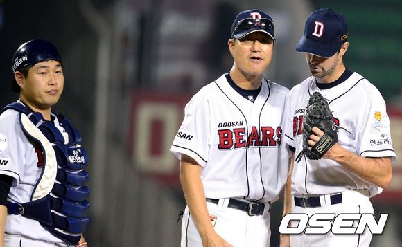 7일 오후 서울 잠실야구장에서 열린 '2013 한국야쿠르트 세븐 프로야구' 두산 베어스와 넥센 히어로즈의 경기, 4회초 무사 1,3루에서 두산 핸킨스가 강판당하고 있다.