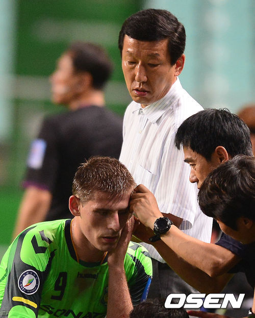 경기 후반 전북 최강희 감독이 출혈로 인해 치료받고 있는 케빈을 바라보고 있다.