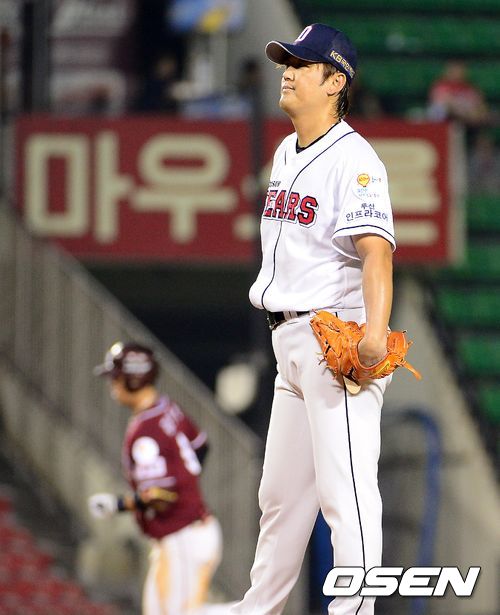 7일 오후 서울 잠실야구장에서 열린 '2013 한국야쿠르트 세븐 프로야구' 두산 베어스와 넥센 히어로즈의 경기, 5회초 2사 1루에서 두산 김선우가 넥센 김민성에 동점 투런포를 허용하고 아쉬워하고 있다.