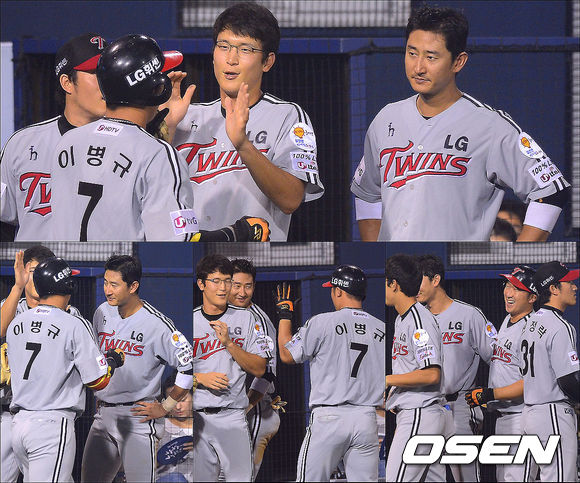 7일 오후 경남 창원 마산구장에서 열린 '2013 한국야쿠르트 세븐 프로야구' NC 다이노스와 LG 트윈스의 경기,5회말 2사 2루 LG 이병규의 2점 홈런때 박용택이 이병규의 하이파이브를 무관심으로 일관하며 장난치자 이병규가 선배의 장난에 미소 짓고 있다.