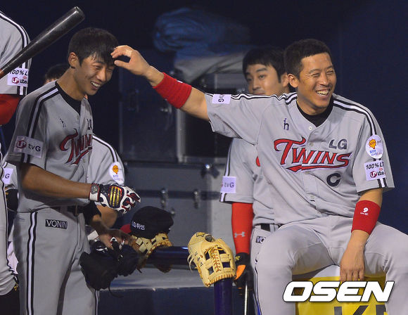 7일 오후 경남 창원 마산구장에서 열린 '2013 한국야쿠르트 세븐 프로야구' NC 다이노스와 LG 트윈스의 경기,8회초 LG 선두타자 김용의가 솔로홈런을 날리자 이병규가 김용의를 격려하고 있다