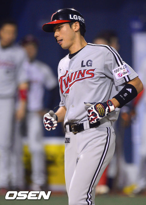 7일 오후 경남 창원 마산구장에서 열린 '2013 한국야쿠르트 세븐 프로야구' NC 다이노스와 LG 트윈스의 경기, 8회초 LG 선두타자 김용의가 솔로홈런을 날리고 홈을 밟고 있다