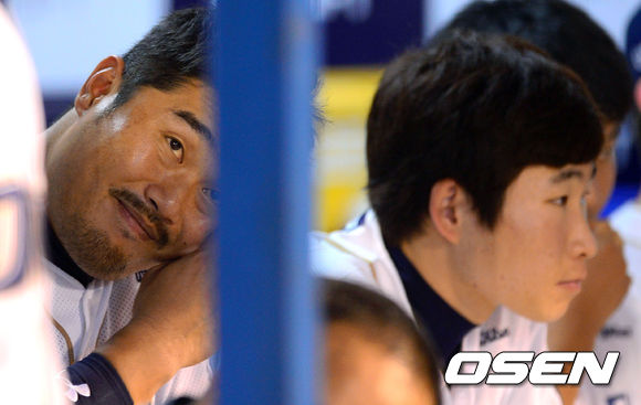 7일 오후 경남 창원 마산구장에서 열린 '2013 한국야쿠르트 세븐 프로야구' NC 다이노스와 LG 트윈스의 경기, 9회초 NC 주장 이호준과 패전 위기를 안고 있는 이재학이 더그아웃에 앉아 경기를 지켜보고 있다. 9회초 현재 LG가 NC를 상대로 13-5로 앞서있다.