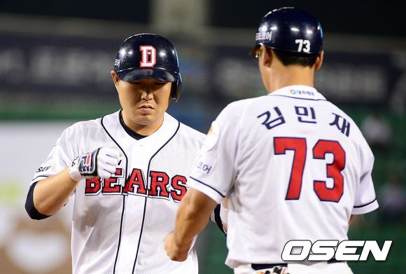 7일 오후 서울 잠실야구장에서 열린 '2013 한국야쿠르트 세븐 프로야구' 두산 베어스와 넥센 히어로즈의 경기, 6회말 2사 만루에서 두산 양의지가 2타점 적시타를 날리고 김민재 코치와 기뻐하고 있다.