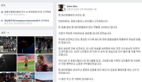 신진호는 이날 자신의 페이스북을 통해 "팬 여러분들에게 드리는 글. 안녕하세요. 포항 스틸러스 미드필더 신진호입니다. 이 글을 빌어 팬 여러분들에게 잠시 작별을 고하려고 합니다"라며 애정이 듬뿍 담긴 작별 메시지를 전했다.