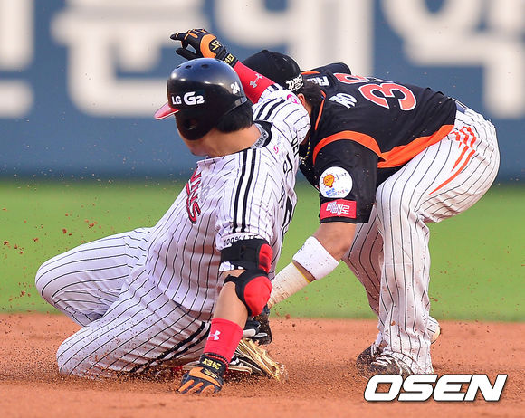 8일 오후 잠실 야구장에서 열린 2013 한국야쿠르트 세븐프로야구 LG 트윈스와 롯데 자이언츠의 경기, 1회말 2사 주자 1루 LG 정의윤이 좌익수 왼쪽 1루타를 날린 후 2루로 몸을 날리며 롯데 2루수 정훈에게 태그아웃을 당하고 있다.