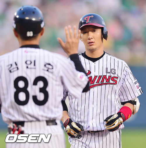8일 오후 잠실 야구장에서 열린 2013 한국야쿠르트 세븐프로야구 LG 트윈스와 롯데 자이언츠의 경기, 2회말 1사 주자 1,3루 LG 손주인이 좌익수 왼쪽 선취 1타점 적시타를 날린 후 1루에서 김인호 코치와 하이파이브를 하고 있다.