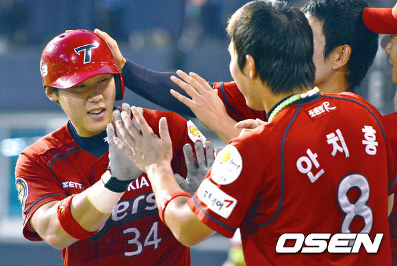 8일 오후 경남 창원 마산구장에서 열린 '2013 한국야쿠르트 세븐 프로야구' NC 다이노스와 KIA 타이거즈의 경기, 4회초 1사 KIA 이홍구가 솔로홈런을 날리고 동료들의 축하를 받고 있다