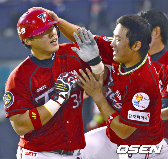 8일 오후 경남 창원 마산구장에서 열린 '2013 한국야쿠르트 세븐 프로야구' NC 다이노스와 KIA 타이거즈의 경기, 4회초 1사 KIA 이홍구가 재역전 솔로홈런을 날리고 안치홍의 축하를 받고 있다.