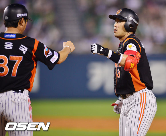 8일 오후 잠실 야구장에서 열린 2013 한국야쿠르트 세븐프로야구 LG 트윈스와 롯데 자이언츠의 경기, 5회초 2사 주자 3루 롯데 전준우가 중견수 앞 1타점 적시타를 날린 후 1루에서 김응국 코치와 하이파이브를 하고 있다.