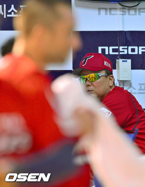 8일 오후 경남 창원 마산구장에서 열린 '2013 한국야쿠르트 세븐 프로야구' NC 다이노스와 KIA 타이거즈의 경기, 5회말 이닝종료 후 KIA 선동렬 감독이 5이닝 2실점 허용한 KIA 새용병 빌로우를 바라보고 있다.