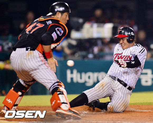 8일 오후 잠실 야구장에서 열린 2013 한국야쿠르트 세븐프로야구 LG 트윈스와 롯데 자이언츠의 경기, 5회말 2사 주자 1루 LG 박용택의 우중간 1타점 적시타 때 1루 주자 윤요섭이 홈으로 쇄도, 세이프 되고 있다.