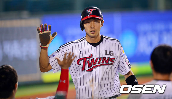 8일 오후 잠실 야구장에서 열린 2013 한국야쿠르트 세븐프로야구 LG 트윈스와 롯데 자이언츠의 경기, 7회말 1사 주자 1,2루 LG 박용택의 중견수 왼쪽 1타점 적시타때 홈을 밟은 김용의가 덕아웃에서 동료들과 하이파이브를 하고 있다.