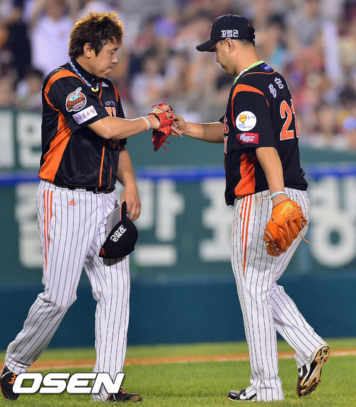 8일 오후 잠실 야구장에서 열린 2013 한국야쿠르트 세븐프로야구 LG 트윈스와 롯데 자이언츠의 경기, 7회말 무사 주자 1,2루 LG 이병규 타석에서 롯데 선발 송승준이 교체되며 이명우가 마운드에 오르고 있다.