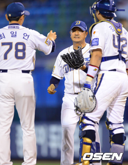 8일 오후 경남 창원 마산구장에서 열린 '2013 한국야쿠르트 세븐 프로야구' NC 다이노스와 KIA 타이거즈의 경기,9회초 2사 1루 KIA 나지완의 타석때 NC 손민한 투수가 교체돼 마운드에 오르고 있다.