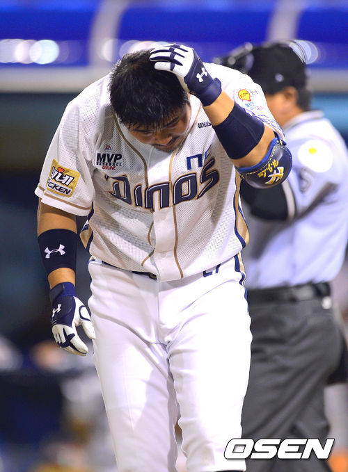 8일 오후 경남 창원 마산구장에서 열린 '2013 한국야쿠르트 세븐 프로야구' NC 다이노스와 KIA 타이거즈의 경기,연장 10말 무사 1,2루 NC 이호준이 KIA 박지훈의 투구에 맞아 고통스러워하고 있다.
