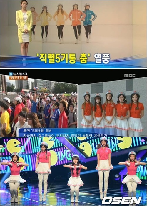 8일 방송된 MBC '뉴스데스크'에서는 '직렬 5기통춤 열풍'이라는 주제로 어느날 갑자기 등장해 가요계를 뒤흔들고 있는 크레용팝을 조명했다. 크레용팝이 큰 인기를 얻고 있는 이유와 크레용 팝의 노래 '빠빠빠' 패러디 열풍 등을 분석한 것.
