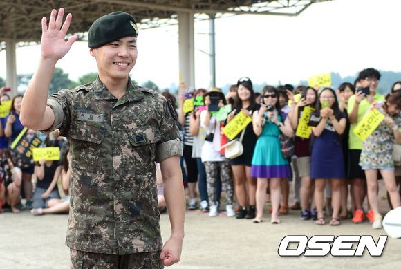가수 휘성이 10일 오전 충청남도 논산 육군훈련소에서 약 21개월간의 군 복무를 마치고 전역해 팬들과 취재진에게 인사하고 있다.