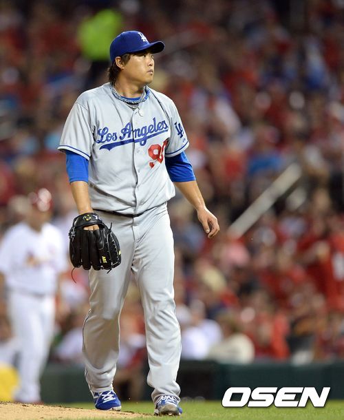 9일(이하 한국시간) 미국 미주리주 세인트루이스에 위치한 부시스타디움에서 벌어진 2013 메이저리그 세인트루이스 카디널스와 LA 다저스의 경기 3회말 류현진이 세 타자를 연속 삼진으로 처리하고 더그아웃으로 가고 있다.