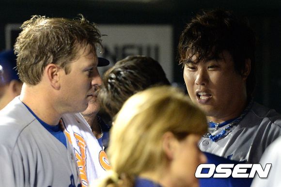 9일(이하 한국시간) 미국 미주리주 세인트루이스에 위치한 부시스타디움에서 벌어진 2013 메이저리그 세인트루이스 카디널스와 LA 다저스의 경기, 6회말 수비를 마치고 다저스 류현진과 엘리스가 더그아웃에서 이야기를 나누고 있다.