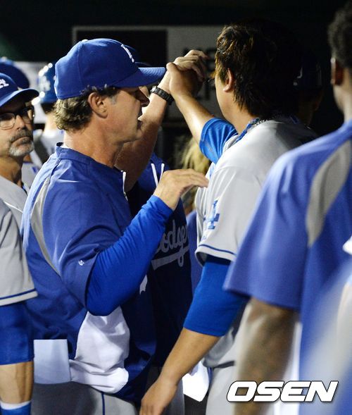 9일(이하 한국시간) 미국 미주리주 세인트루이스에 위치한 부시스타디움에서 벌어진 2013 메이저리그 세인트루이스 카디널스와 LA 다저스의 경기, 7회말 수비를 마치고 다저스 류현진이 더그아웃에서 돈 매팅리 감독의 격려를 받고 있다.
