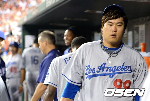 9일(이하 한국시간) 미국 미주리주 세인트루이스에 위치한 부시스타디움에서 벌어진 2013 메이저리그 세인트루이스 카디널스와 LA 다저스의 경기, 7회말 수비를 마치고 다저스 류현진이 더그아웃에서 푸이그, 유리베의 격려를 받고 있다.