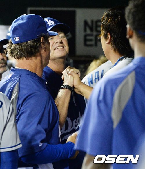 9일(이하 한국시간) 미국 미주리주 세인트루이스에 위치한 부시스타디움에서 벌어진 2013 메이저리그 세인트루이스 카디널스와 LA 다저스의 경기, 7회말 수비를 마치고 다저스 류현진이 더그아웃에서 릭 허니컷 투수코치의 격려를 받고 있다.
