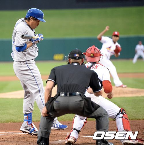2회초 첫 타석에 들어선 류현진이 마르티네스의 몸쪽 공에 화들짝 놀라고 있다. /sunday@osen.co.kr
