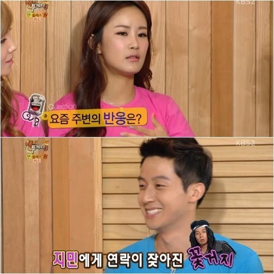 김지민은 지난 8일 방송된 KBS 2TV 예능프로그램 '해피투게더3' 원 플러스 원 특집에 출연해 "허경환이 원래 내게 연락을 안했는데 '떴다고 나대지 말라'고 문자를 보냈다"고 털어놨다.