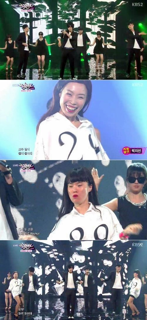 9일 방송된 KBS 2TV '뮤직뱅크'에서 엠아이비는 신곡 '들이대'의 무대를 미모의(?) 두 개그우먼의 지원 속에 펼쳤다.