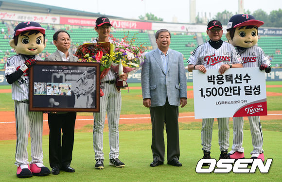 9일 오후 잠실구장에서 열린 '2013 한국야쿠르트 세븐프로야구' LG 트윈스와 롯데 자이언츠의 경기전 진행된 LG 박용택 1,500안타 달성 기념 시상식에서 KBO 구본능 총재와 LG 백순길 단장, 김기태 감독, 박용택이 포토타임을 갖고 있다.